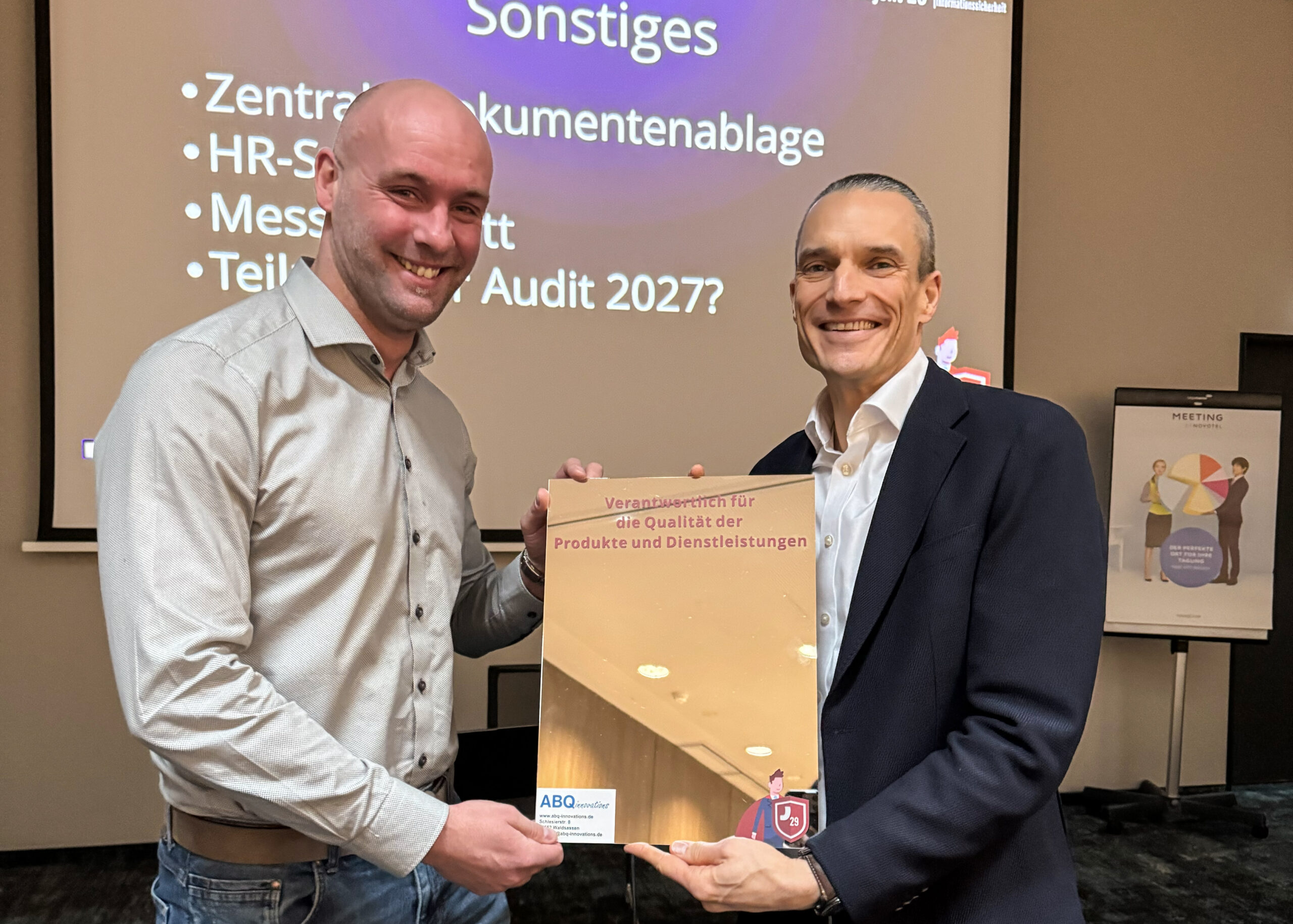Unser Dank gilt Gerald Riederer von ABQinnovations, der uns auch über die Erstzertifizierung hinaus mit fachlicher Expertise und klarem Blick begleitet hat.